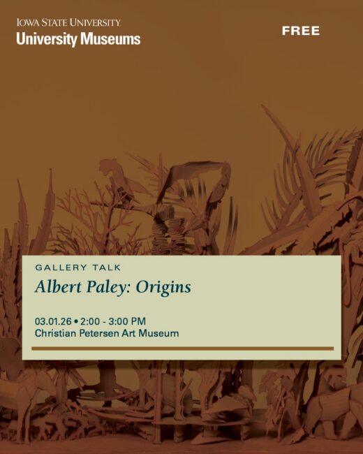 Christian Peterson Art Museum 1017 Morrill Hall, 603 Morrill Rd, Ames, IA, United StatesDiscover the work of internationally recognized metal sculptor Albert Paley in this free guest lecture. Anne Pagel, Curator of the Karen and Robert Duncan Art Collection, explores how Paley transforms metal into bold, evolving sculptures that investigate form, materials, and innovation. Learn how his sculptures create a dynamic dialogue between art and architecture in public spaces, including Iowa State’s own Transformation, a public art installation at the east entrance of Morrill Hall.